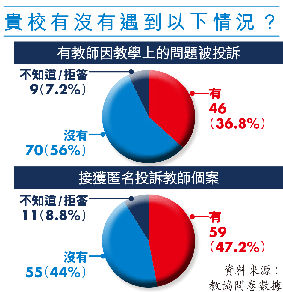 教協10月27日至11月9日就事件向中小學及特殊學校校長派發問卷,收獲125個有效回覆。數據顯示,逾七成校長(72.8%)認為教局取消教師註冊理據說服力不足,另有近半校長(47.2%)曾接匿名投訴教師個案;約37%校長指有教師因教學問題被投訴,約25%反映有教師因私人場合言論版投訴,包括社交平台帖文。