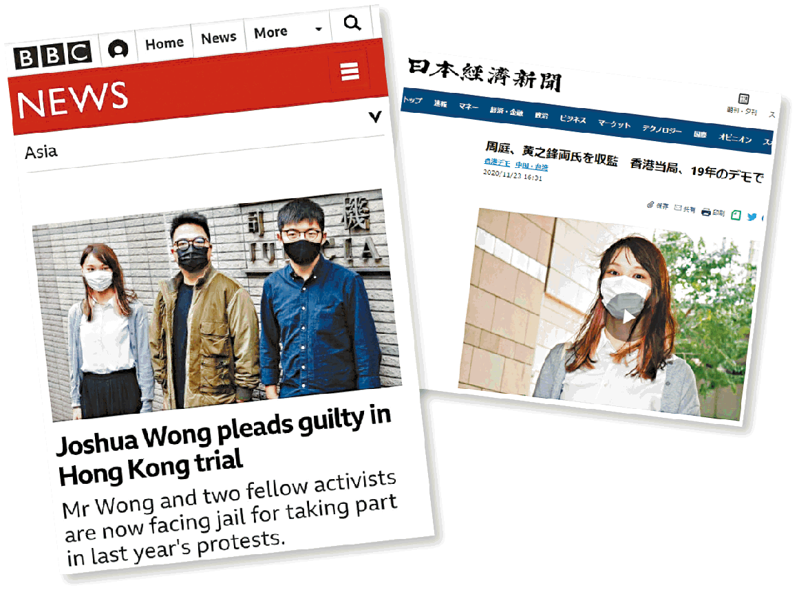 三人還柙候判的消息引起多國傳媒關注,當中周庭在日本知名度甚高,消息引起當地多個主流傳媒報道,包括《讀賣新聞》和《朝日新聞》等,富士新聞網以「民主之女神」形容周庭,共同社則形容事件是加強打壓民主派。另外,英國廣播公司(BBC)回顧黃之鋒社運生涯及曾入獄,並引述分析指港版國安法已證實自由收窄的憂慮,更容易嚴懲當事人。
