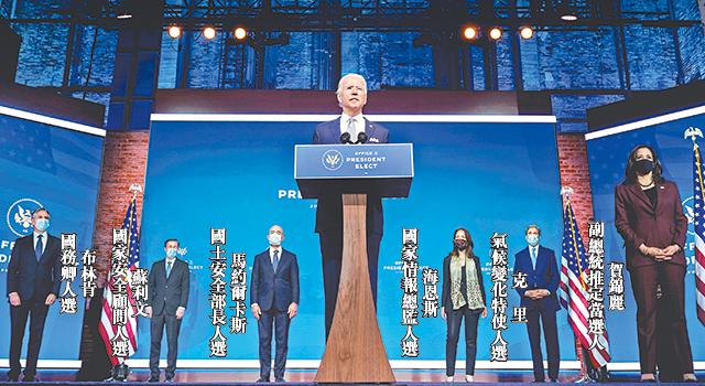 美國總統推定當選人拜登前天開記者會介紹他提名的外交國安團隊,指這支以資深奧巴馬前朝官員組成的團隊,展示他要讓「美國回來領導世界」,扭轉特朗普政府的「美國優先」政策。現任國務卿蓬佩奧反擊指拜登想恢復的多邊主義,只是和稀泥,亦有共和黨參議員批評拜登團隊對華軟弱,「令人提不起精神」。