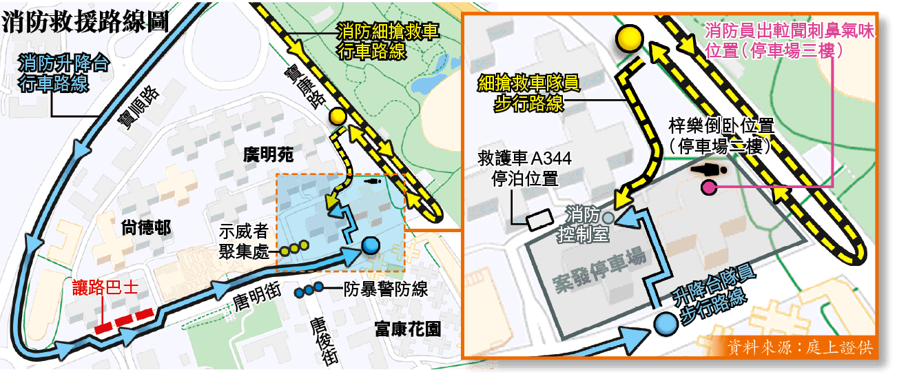 當日擔任現場總指揮的消防隊長詹德鵬則供稱,當晚升降台駛至唐明街時,原本停泊路上的數輛巴士緩緩讓路。惟由於尚十路口地面有磚頭,兩邊有示威者及防暴警,詹遂決定不駛入尚德邨,而在停車場旁的巴士站下車步行去消防控制室。詹續指,有隊員巡查停車場時發現2樓有傷者,要求支援。詹趕赴案發現場期間,用手機致電消防控制中心要求派救護車增援,並要求中心叫救護車主管以電話聯絡他。他說因有示威者及警員聚集,「俾我意識到呢件事可能比較敏感,可能之後做證供」,故他回到消防局後,便即日查看了有關時序。