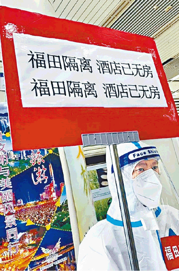 王小姐指:「因為帶孩子的,這還優先了!昨天200多人沒有酒店住。」另有網民分享關口照片,身穿防護服的防疫人員舉牌指「福田隔離酒店已無房」;龍崗區隔離酒店房位亦不足,部份過關者須轉往醫院暫時安置。也有網民指深圳隔離酒店不足,部份港人須轉往東莞、中山隔離。不過,本報記者昨致電深圳維也納酒店,職員指港人出示病毒檢測陰性證明和健康綠碼就可以入住,昨晚6時入住,仍有房間提供,屆時直接到前台辦理入住手續即可。