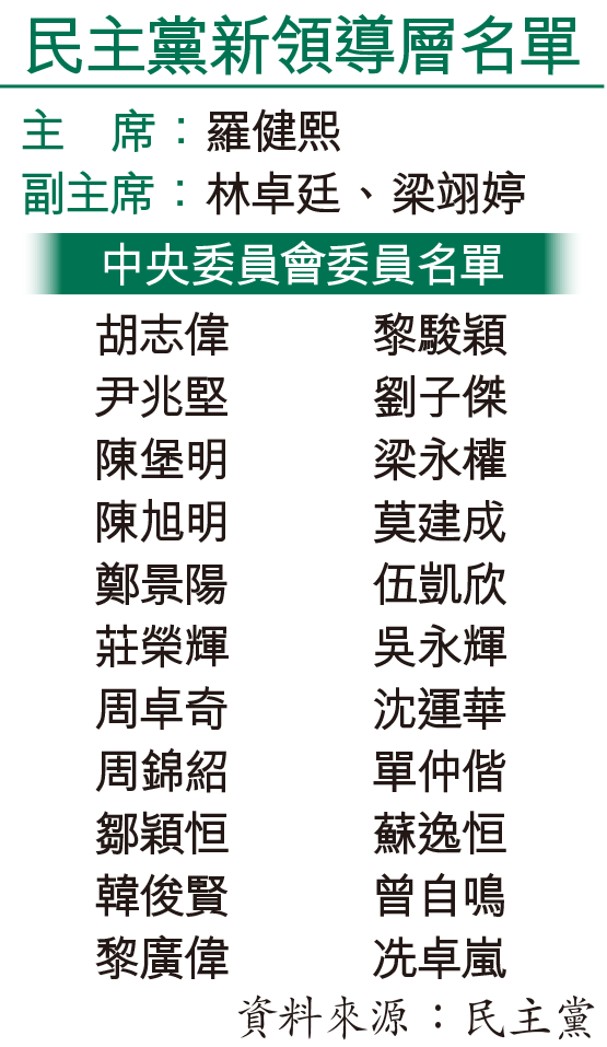 民主黨昨召開會員大會,胡志偉早前表明不再任主席,羅健熙當選主席,他2006年加入民主黨,2012年起出任南區區議員,同年當選民主黨副主席。