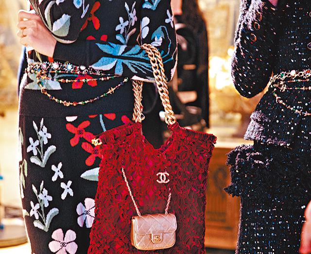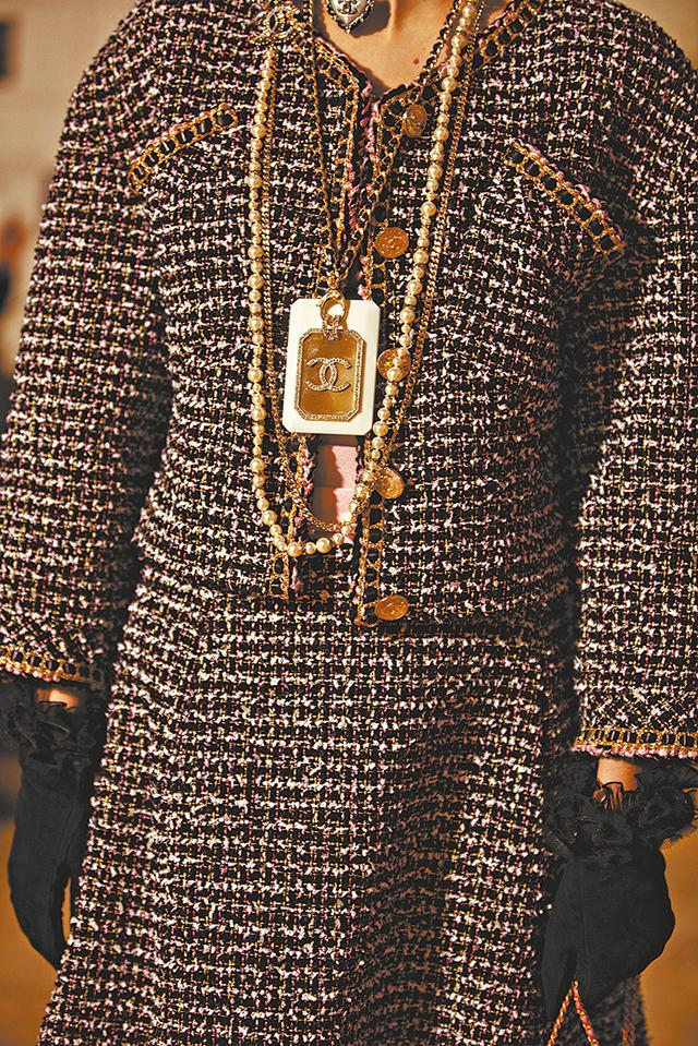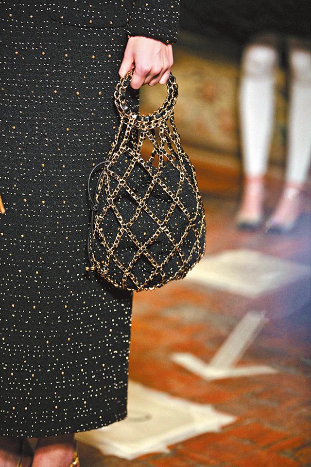 手袋方面,四方菱格金片CC logo成為焦點,用色大膽互撞的double bags、魚網tweed bags,華麗型格。珠寶也充滿浪漫和趣味,垂在耳邊的珍珠串頭箍、城堡建築上的「雙C 」符號長耳環、rock味ribbon choker,以及掛在胸口的卡片套等,高雅貴氣也有型。