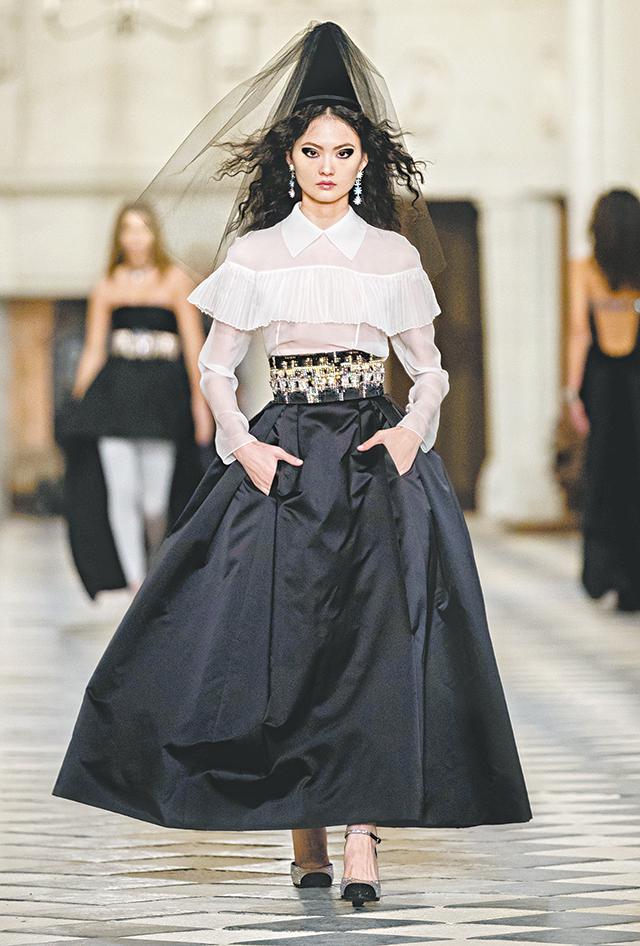 黑白銀為主調的服裝,結合16世紀古典和現代的摩登自由氣息,文藝復興時代的衣櫥,通過Virginie的多元化美學mix up,變成屬於Chanel版新裝。甫開場,中分長曲髮的模特兒穿上金刺繡粉紅兩件頭套裝,配80年代厚膊、金屬色leggings登場;經典呢絨外套或大衣內,帶來驚喜tweed playsuit外配lace ruffs。Chanel的菱格和城堡地板的黑白菱格雲石呼應,變作長裙、retro黑色車線皮革背心。女人為女人設計的輕鬆時裝有長袖連身裙、千鳥格大衣,飾滿宮廷風的大串大串珍珠、腰鏈裝飾,簡約舒服也自主變化度高。來到晚裝,城堡兩位前主人故事的「黑新娘」版長到拖地的抹胸黑晚裝、超高紗黑帽; Atelier Montex工藝坊將城堡變成迷你版的珠寶腰帶,展現工藝坊的獨門傳承。