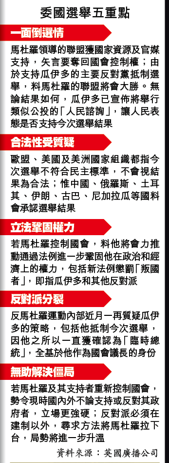 委內瑞拉昨天舉行國會選舉,在部份反對派抵制、兼且西方各國齊聲指控有舞弊的情況下,總統馬杜羅及其執政統一社會主義黨(PSUV)與盟友,幾可肯定會取回國會控制權,委國民主將被徹底滅聲,獲美國政府支持的反對派領袖瓜伊多將進一步邊緣化。