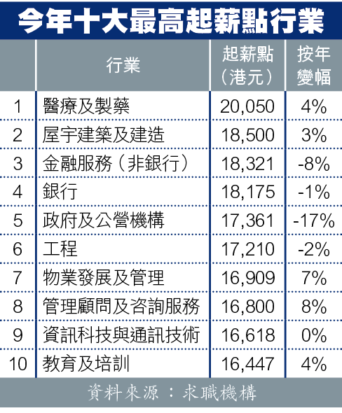 Jobsdb今年8至10月共訪問1,197名本地大學生及畢業生,平均起薪點最高行業為醫療及製藥,達20,050元,按年升4%;金融服務及銀行分別達18,321及18,175元,跌8%及1%;政府及公營機構急挫17%至17,361元。
