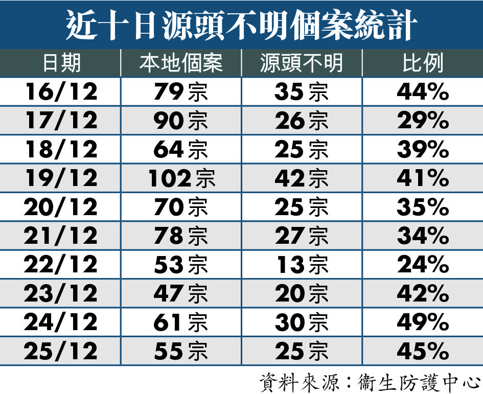 【本報訊】本港昨新增57宗武漢肺炎確診個案,宗數是12月至今的第二低,但近日源頭不明個案所佔比例卻呈上升趨勢,每日本地個案當中都有近一半找不到感染源頭。衞生防護中心指出,不明源頭個案比例偏高,令疫情容易反彈,難以真正放緩。專家認為,現時市面仍很多人逛街及聚會,社區有很多隱形傳播鏈仍未截斷。