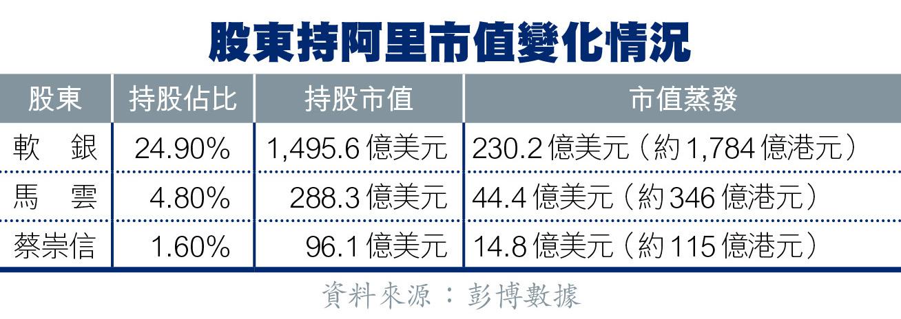 孫正義慘受牽連,其軟銀的阿里持股蒸發230.2億美元市值,跌至1,495.6億美元。軟銀市值也不過是1,553億美元,阿里持股已幾近一間軟銀集團,是軟銀最為重要的投資,軟銀發言人對事件不予置評。阿里創辦人馬雲對阿里持股4.8%,持股市值288.3億美元,市值蒸發約44.4億美元(約346億港元);執行副主席蔡崇信則持價值96.1億美元、1.6%股權。
