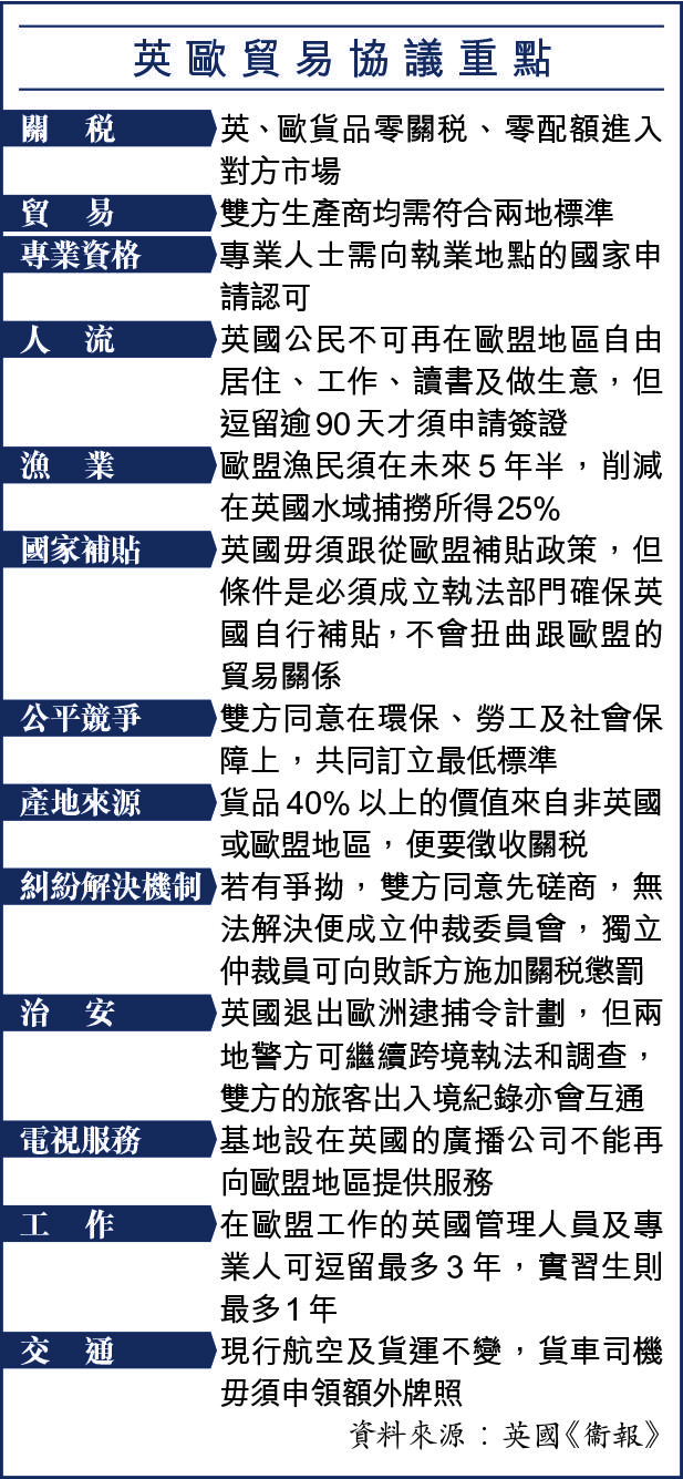 前天達成的新協議,維持了英歐貨物貿易的零關稅零配額安排,雙方可各自制訂監管法規,如有爭端由仲裁委員會化解。捕魚權問題也中間落墨,讓歐盟漁船在五年半過渡期內可繼續在英國水域捕魚,之後全由英方決定。