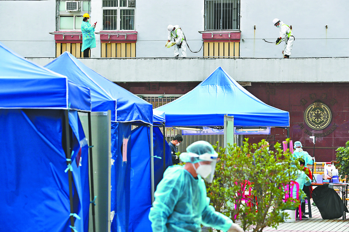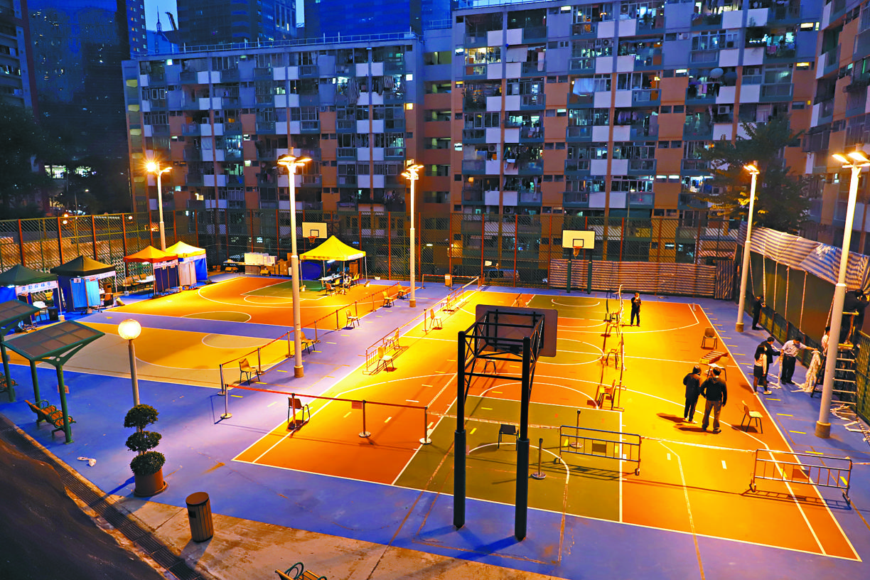 玉蓮臺第二座附近、花園大廈孔雀樓對的開籃球場昨傍晚有多名工作人員設置流動採樣站,帳篷掛上橫額,印有「華昇」及簡體字「華大基因」,料為強制檢測做準備。工作人員亦掛起大幅帆布,分隔籃球場和毗連民居。
