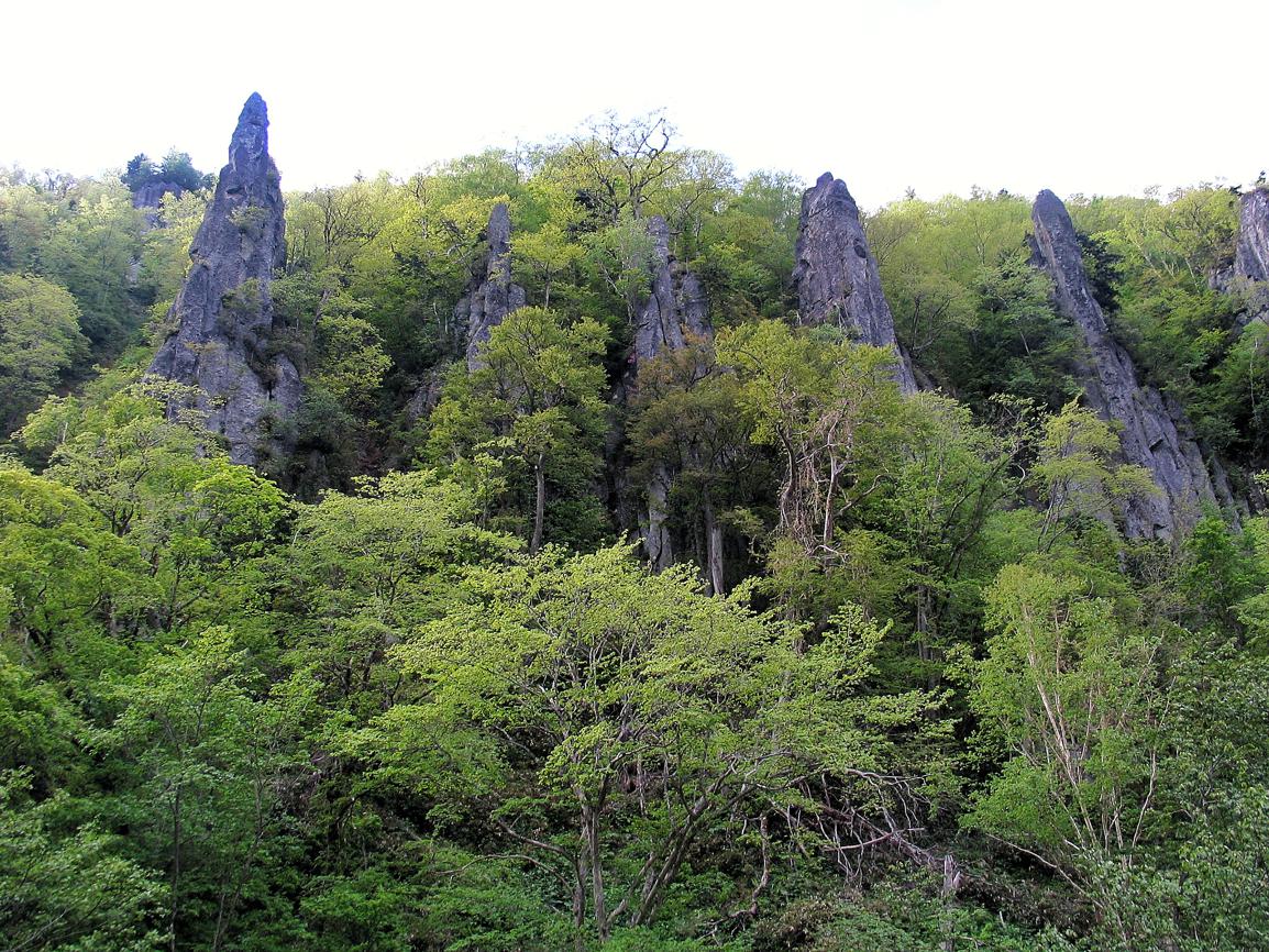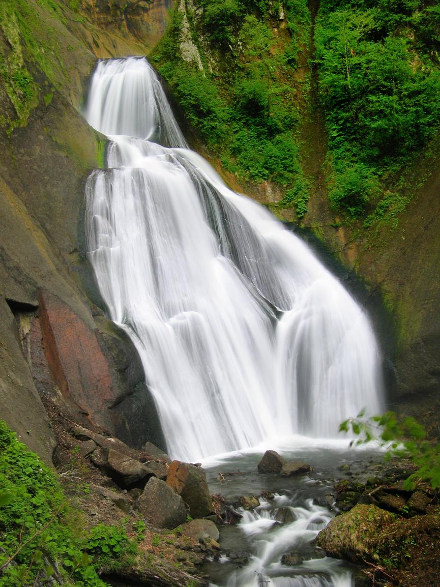 天人峽每天只有一班巴士往來旭川巿,先回到分叉路口等候轉車的方法也行不通,只好託青年旅社員工召喚的士,用錢買時間(費用超過5,000日圓)。流量充沛的忠別川源自忠別岳,是日本第三長河石狩川的一大支流,名字來自愛努語, 「チゥ」即「波」,「ペッ」是「川」,意即「波立つ川」,滾滾波濤的河流,一如其名,長年白浪翻騰、波瀾不息。峽谷兩旁不少急速冷卻的熔岩沿柱狀節理風化成的柱石群,「七福岩」、「見返り岩」……都有名字,都有故事。經過溫泉街盡頭「天人閣」,先沿忠別川左岸上溯,途中經過支流出口,再過橋到右岸,半小時後,便到達「敷島の滝」,雖然只有20米落差,水勢浩大如山洪暴發。步道到此為止,沿溪仍可繼續上溯,但溯溪並非是次目的,折回支流峽谷入口,滿谷新綠之間,羽衣瀑布的下段,就在眼前。