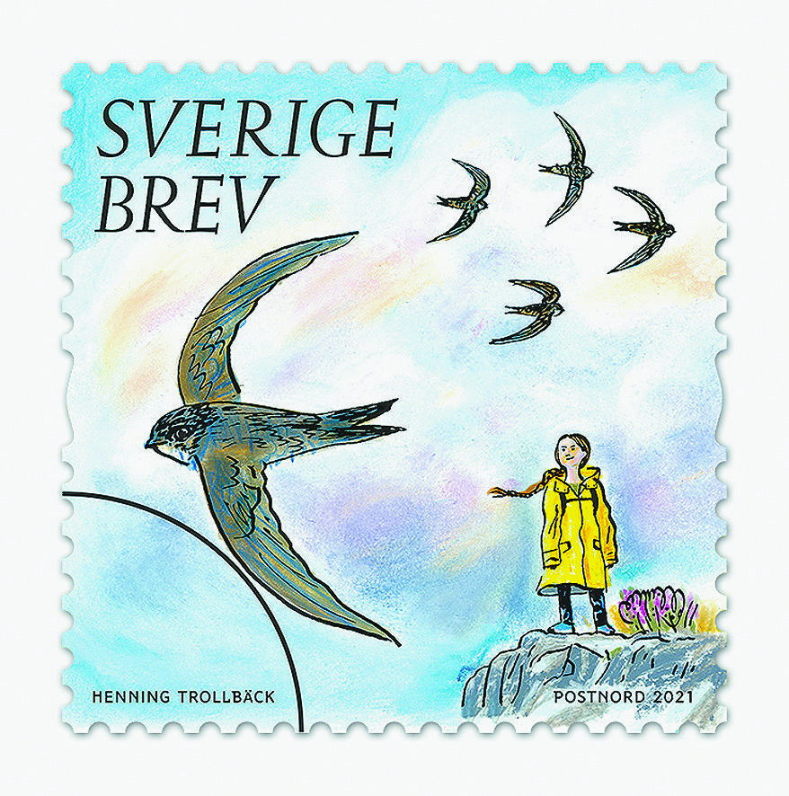 瑞典發行以大自然為主題的郵票,其中一款郵票印有「環保少女」通貝里(Greta Thunberg)的畫像,表揚她「為下一代保存瑞典獨特的大自然」的努力。