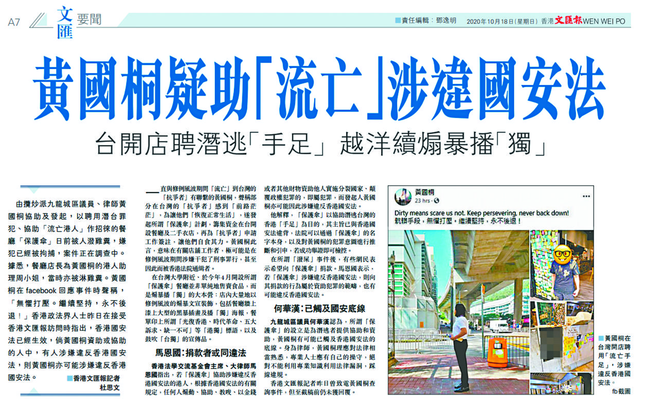 警方昨日大搜捕11人,最觸目的是拘捕了過去一年多以來多次協助抗爭者的律師黃國桐。他另一個廣為人知的身份,是有份在台灣發起名為「保護傘行動」的項目,開設保護傘餐廳及商店,藉着聘請「流亡」台灣的香港抗爭者為店舖工作,讓他們能夠在當地自食其力。