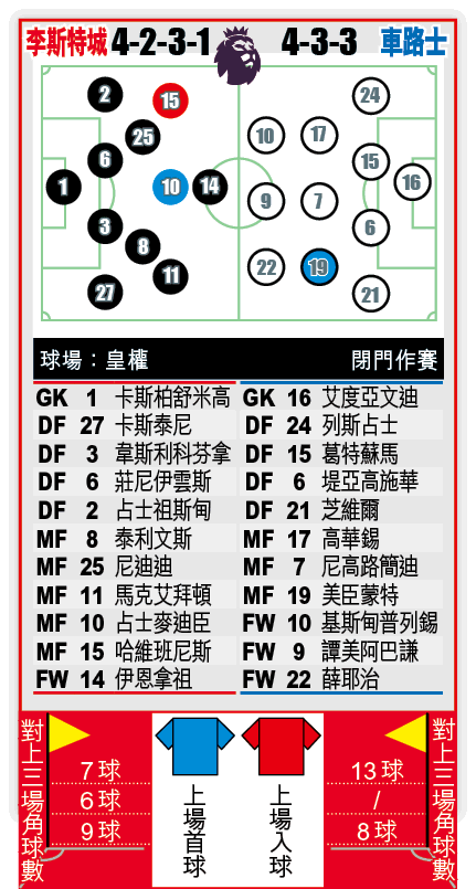 上仗射手華迪復出擔正,不過補時階段因臀部舊患復發,領隊羅渣士安全起見決定換走這位34歲老將,此子今仗亦上陣成疑。雖然華迪可能缺陣,但李城現時的入球分佈已比往年廣,上周六雙雙建功的麥迪臣及班尼斯可擔起入球重任(見另文)。此外,近期李城防線表現出色,6場不敗之中僅失4球,小將韋斯利科芬拿快速融入之下,已經搶走蘇恩古的正選位置,與莊尼伊雲斯合作的防守組合,可令近期火力一般的車路士頭痛。