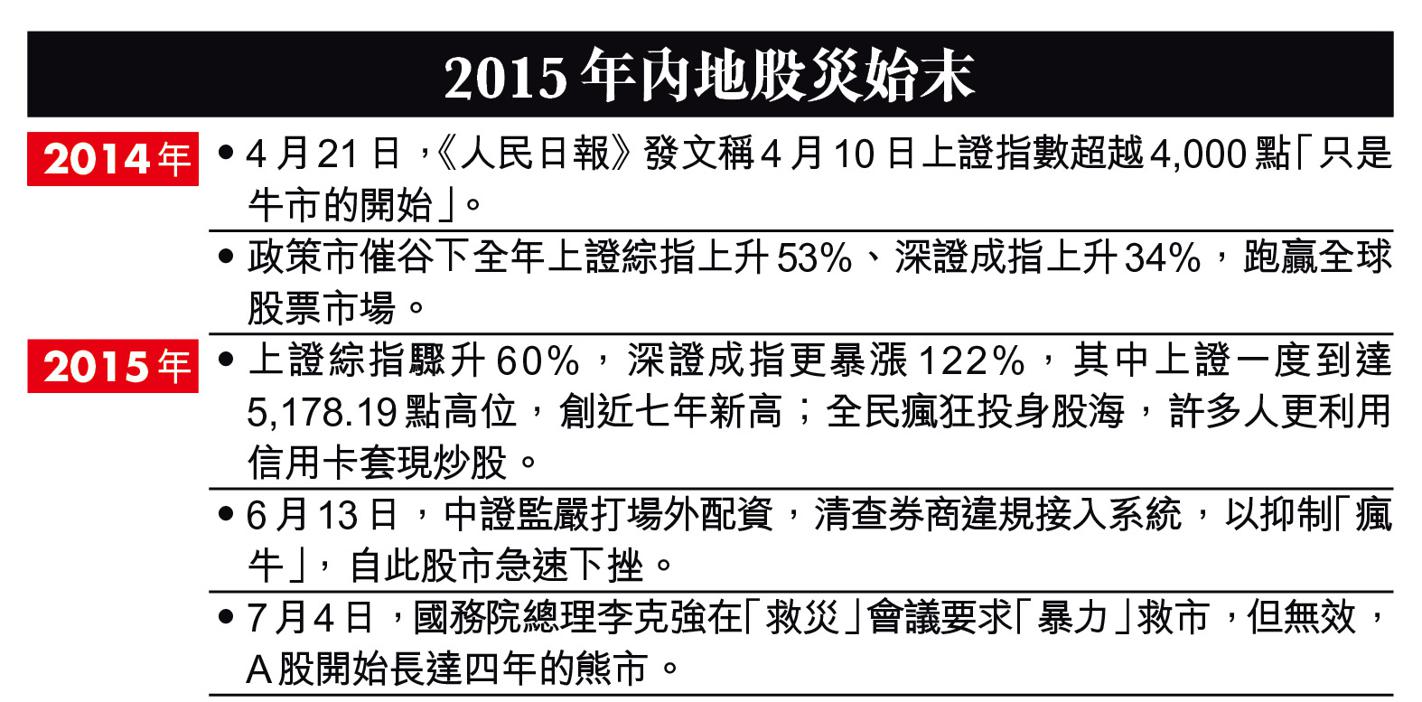 翻查資料,內地曾多次出動國家隊救市。2015年A股在政策市催谷下兩個月暴漲四成,至6月卻急挫四成。總理李克強力主暴力救市,據悉救市方案規模達1.72萬億人民幣,加上大量行政手段禁止「惡意沽空」,集中購買藍籌股ETF。惟市場恐慌下越救越衰、越衰越沽,A股跌勢到2016年2月才告一段落,不少官員因此下馬,包括銀保監主席項俊波、中證監副主席姚剛等;A股亦從此開始了長達多年熊市。