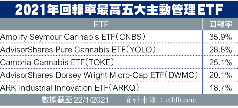 【本報訊】「連登契媽」ARK Invest創辦人「女股神」Cathie Wood管理的五隻主動管理交易所買賣基金(Actively Managed ETF),過去一年投資回報介乎113.9%至224.2%,橫掃主動管理ETF表現排行榜冠亞季殿軍及第五名;惟今年初至今,主動管理ETF投資回報三甲位置已變成大麻主題。美股資深投資者吳瑞麟相信,Cathie Wood打骰的ETF難以在新一年蟬聯冠軍,再倍升機會微。