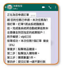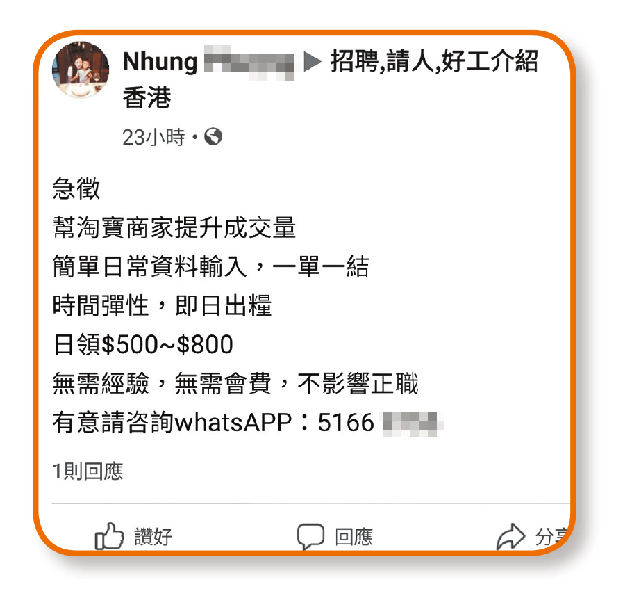 全職媽媽Karman(化名)與丈夫育有兩名分別1歲及4歲的小朋友,一家四口生活僅靠地盤工的丈夫維持,但在疫情下收入大受影響。為幫補家計,早前她於一個媽媽群組看見一則招聘,「有冇喺屋企湊小朋友嘅媽媽想賺下外快,搵奶粉錢」,於是聯絡自稱是內地網購平台客服,始知其工作是「刷手」。