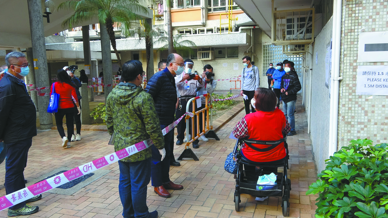 【本報訊】深水埗麗安邨麗平樓上周五兩單位共四人確診,被列入強制檢測,事隔一日,當局昨才在麗平樓對開空地設臨時檢測站。昨早原定開放時間前,有約40人排隊候檢,大部份為長者。有居民直指拖足一日才安排強檢「有啲遲」,擔心有染疫住客周圍走。運房局長陳帆下午抵達,向排隊等候檢測的居民了解情況,逗留15分鐘後快閃離去。