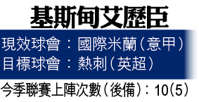 艾歷臣一年前懷着終於甩難的心情由熱刺轉投國際米蘭,沒料到一年以來一直難以適應意大利足球以至生活,球場上發揮越來越差,便越來越不受國際主帥干地重用下,正尋求在轉會窗關閉前離隊。艾歷臣昔日為熱刺提供極大創造力,這亦是目前熱刺所需,不排除這位丹麥中場會再戰英超重投前屬球會。