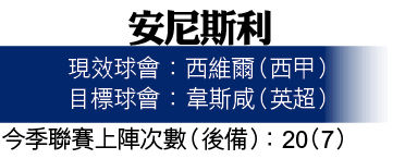 韋斯咸今季表現大躍進,一下子成為英超爭逐前四分子,領隊莫耶斯希望趁1月再加強人腳實力,以更強火力保持佳績。莫帥看中的目標是西維爾前鋒安尼斯利。這名摩洛哥前鋒在今季西甲的入球已達雙位數,惟交易最大阻力是轉會費問題,據悉韋斯咸開價約2,200萬鎊,惟西維爾方面要求獲得不少於3,500萬鎊才肯放人,幾乎是韋斯咸開價的一倍。