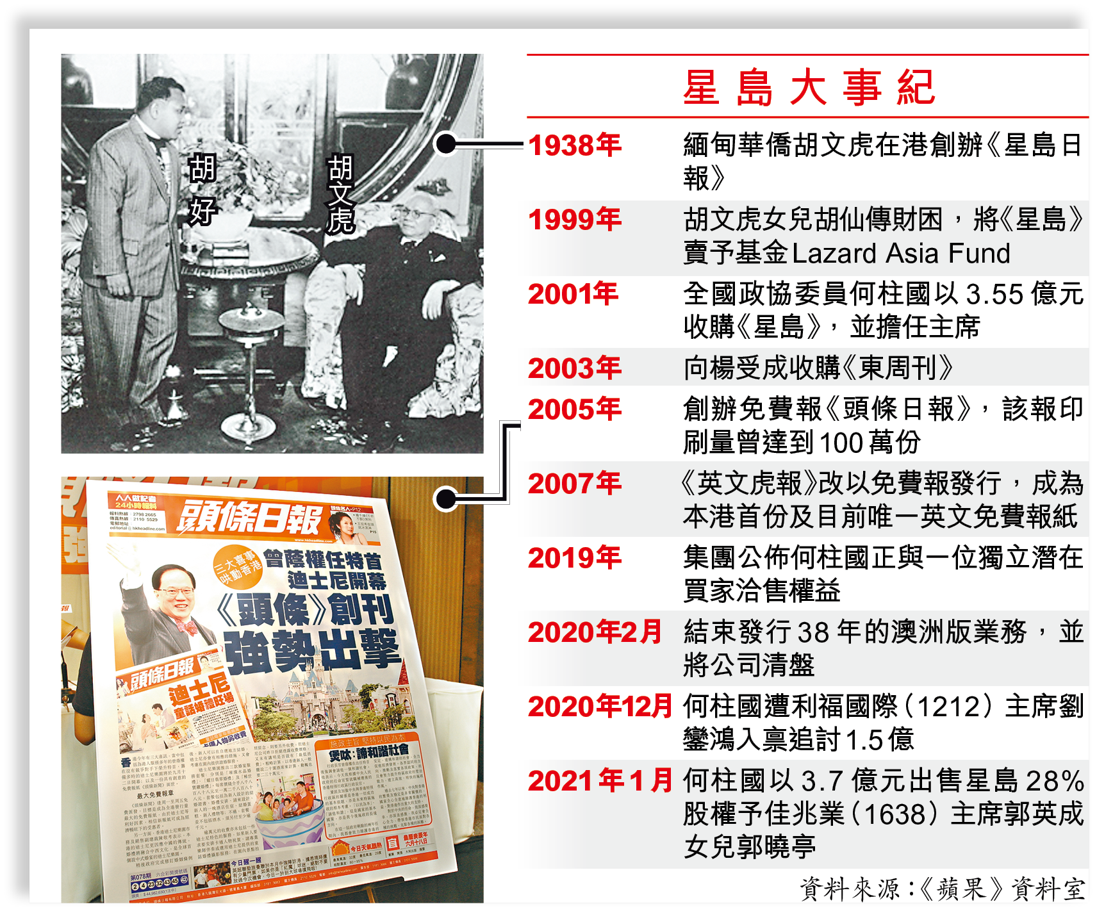 計及今次賣盤,星島經歷三度易手。該報1938年由「萬金油大王」、緬甸華僑胡文虎創辦,初期政治取向為反共;至1999年胡文虎女兒胡仙傳財困,決定賣盤,由基金Lazard Asia Fund接手。直至2001年再由全國政協委員何柱國透過泛華集團以3.55億元收購;自此星島政治取向轉至親中,包括2003年支持23條立法、2019年社運揚言要「止暴制亂」。
