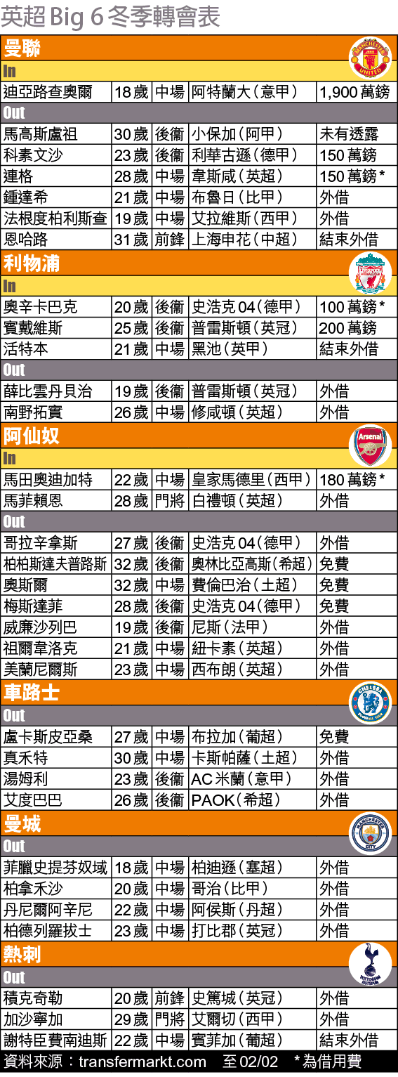 若計整個冬窗出手最闊綽的Big 6球會可算是曼聯,事關紅魔去夏已宣佈從阿特蘭大羅致的18歲中場迪亞路查奧爾,冬窗正式以1,900萬鎊轉會費加盟,連計附加條款轉會費可高達3,700萬鎊,他將與養傷近八個月的菲爾鍾斯成紅魔「新兵」,被列入下半季大軍名單。曼聯同時在周二宣布,今季未曾為過曼聯一隊上陣的馬高斯盧祖,亦已重返家鄉阿根廷並轉投阿甲班霸小保加。至於阿仙奴就繼續大清洗,死線日有梅斯達菲免費加盟史浩克04,祖爾韋洛克及美蘭尼爾斯就以借用形式離隊,整個冬窗掃走八名球員,當中奧斯爾、梅斯達菲以及柏柏斯達夫普路斯均是免費離隊,對當初花費9,510萬鎊引入3人的阿仙奴來說可謂「蝕到入肉」。