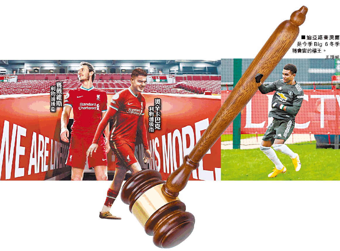冬季轉會窗在周一完結,一如所料各隊因受疫情財困影響,導致冬窗「消費」意欲大降,過往幾年在轉會窗投入不少的英超,今個冬窗只有曼聯以1,900萬鎊(約1.8億港元),從阿特蘭大正式簽入迪亞路查奧爾,已成為Big 6使費最多的球隊,其餘的Big 6球隊都只是減磅為主,除了衞冕的利物浦受中堅荒影響,才於死線日連簽兩名後衞救亡。