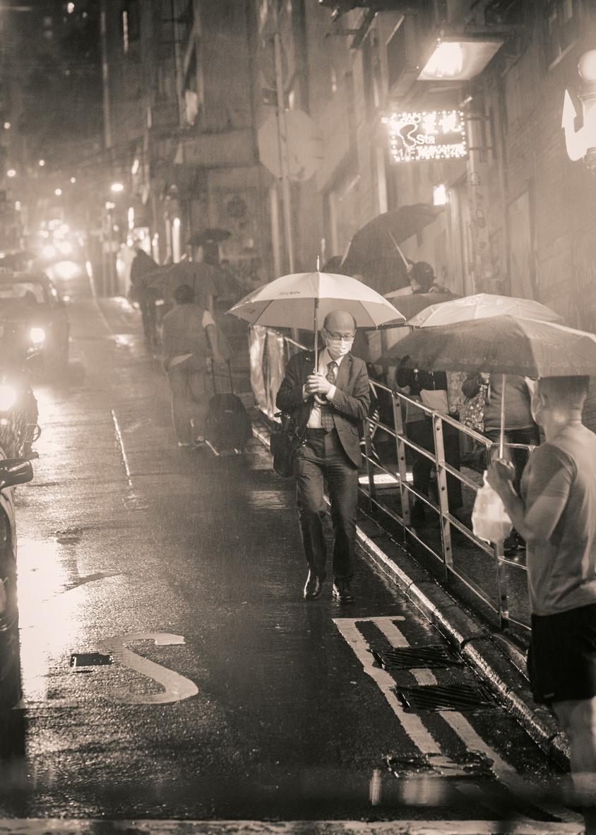 Andrea的鏡頭不見壯觀的建築物,反而透過捕捉街頭的點滴、日常生活的微妙瞬間,呈現香港的活力。「每日堅持拍攝照片,這聽起來很簡單,困難之處是作品的主題既要豐富多元,同時每張照片都有趣味的故事。」家住西營盤的她,有天在街上見到店舖內有兩隻小狗,其中一隻更好奇地望向鏡頭,她於是蹲下來以狗狗的視覺拍攝,整個畫面非常有趣,令人想起美國攝影師Elliott Erwitt的小狗作品。在她經常途徑的鴨巴甸街,人們撐着傘在雨夜下彳亍而行,由於行人路比較狹窄,經常有人在馬路邊行走,她的鏡頭正好捕捉這個很日常的時刻。