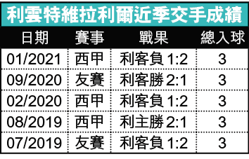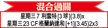 巴塞隆拿雖然目前在西甲排次席,但明顯今季演出失去前幾季的鋒芒,在盃賽的盤路更令人失望,近4場[-1]的盤路竟只得1和3輸,加上有主場之利的格蘭納達近季進步神速,目前在聯賽排中上游,料巴塞只能小勝。至於另一場利雲特(圖)近5次遇上「黃色潛艇」維拉利爾均開[3球](見附表),一於信往績,今場博[3球]。(球賽編號:星期三7;明日2:00am開賽)