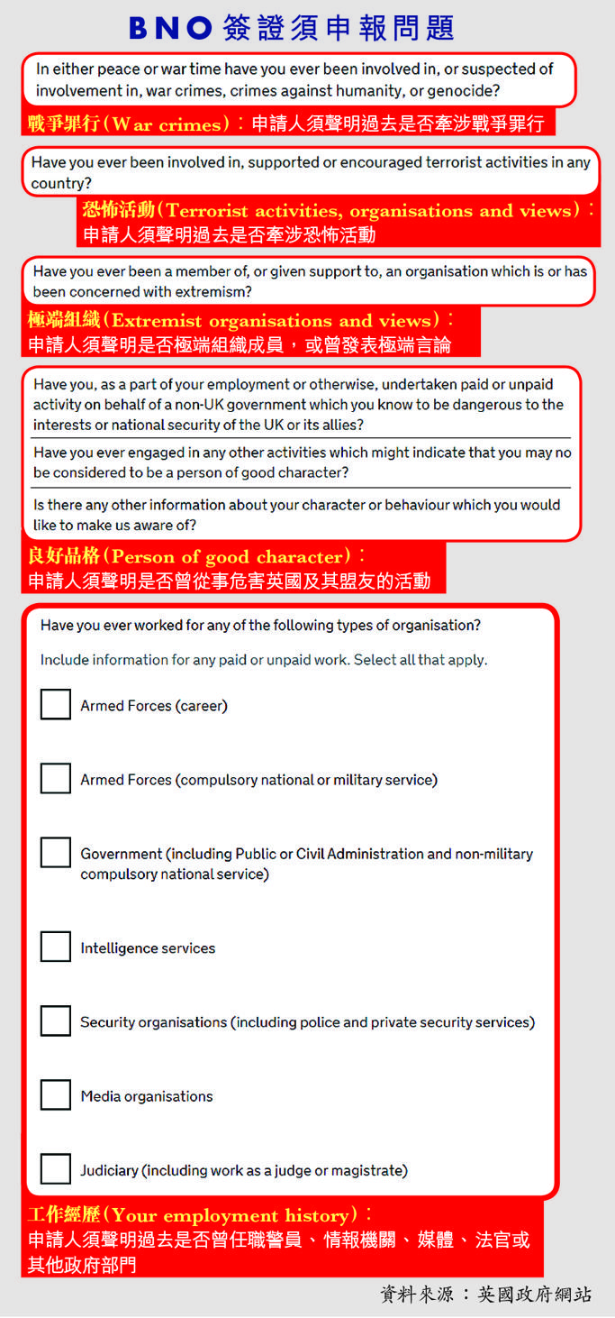 根據BNO簽證申請網站,當中有多條問題涉及申請人背景的「安全審查」,包括要求申請人聲明過去是否牽涉戰爭罪行、恐怖活動;是否極端組織成員,或曾發表極端言論。值得關注的是申請人要作出兩項聲明,分別是「良好品格」及「工作經歷」,申請人須聲明過往有否參與任何危害英國國家安全行為、過往有沒有不良行為,亦要主動申報對其品格不利資訊。