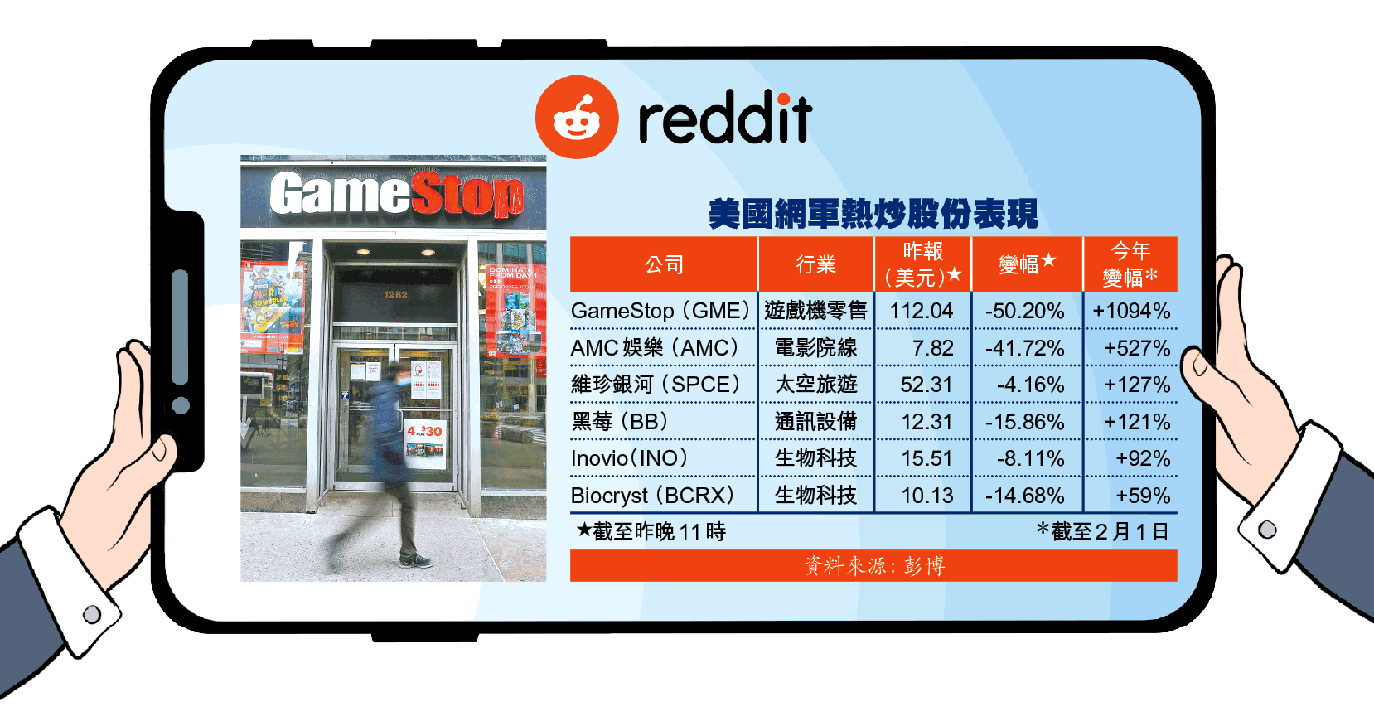 另一方面,沽空機構渾水創辦人兼行政總裁布洛克(Carson Block)昨日彭博訪問表示,懷疑GME風波有對沖基金參與,更形容同業「自相殘殺」。他表示GME等股票升勢中看到了似曾相識的軌迹,拋物線走勢不太像Reddit上的散戶所為,更像對沖基金互相針對同業的挾淡倉行動。《華爾術日報》昨引述消息稱Netflix跟奧斯卡金像獎編劇Mark Boal接洽,計劃把GameStop挾淡倉風暴改編成為電影。