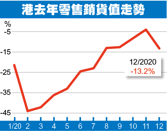 政府發言人表示,受本地第四波疫情和因而實施的社交距離措施影響,去年12月零售銷售的跌幅擴大。至於去年零售業總銷貨量錄得有紀錄以來最大的年度跌幅,反映疫情對與消費相關活動造成的嚴重衝擊。發言人指出在訪港旅遊業冰封及本地疫情持續下,零售業的經營環境在短期內仍然充滿挑戰。