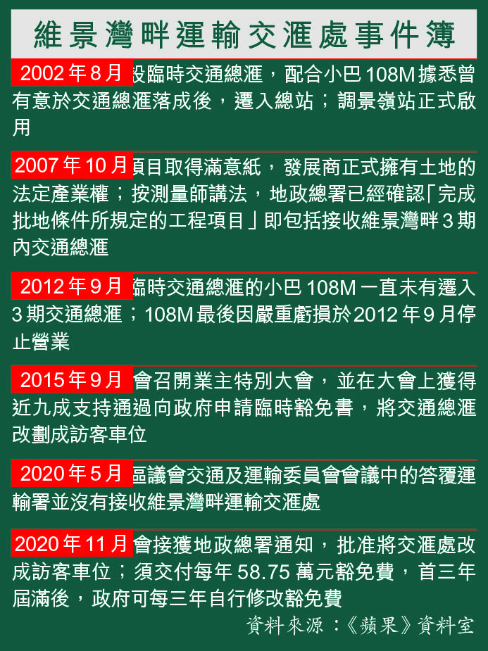 本報向運輸署查詢,運輸署引用其於西貢區議會交通及運輸委員會會議中的答覆回應指:「維景灣畔第3期的有蓋運輸交滙處位於將軍澳市地段第55號,為私人擁有及管理,運輸署並沒有接收上述的運輸交滙處。現時該運輸交滙處並沒有公共運輸服務使用,運輸署現時亦沒有計劃安排巴士及專線小巴路線使用該運輸交滙處。」
