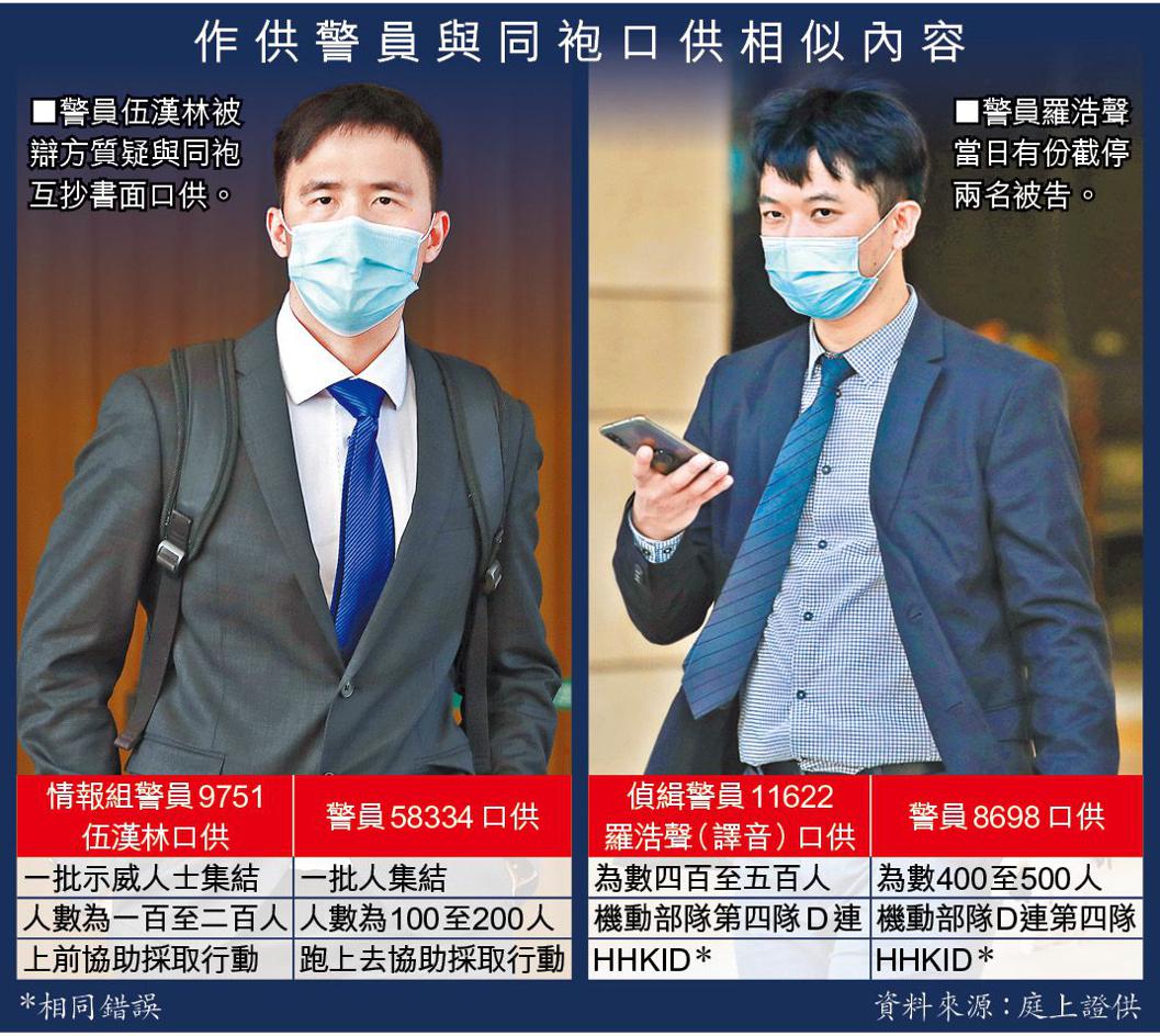 辯方再指,口供提及看管六名被捕人士及檢查身份證時,兩人口供均寫「HHKID」,誤寫多一個「H」字。大狀問:「一模一樣咁錯,你有咩解釋呀?」羅謂「冇解釋」,但再次否認與同袍互相抄襲口供。審訊今續。