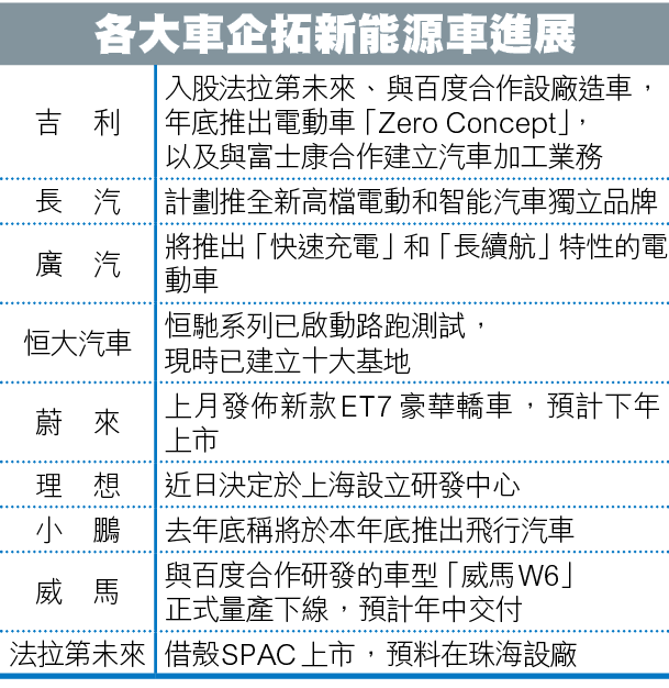 吉利控股亦努力加強代工和控股其他品牌,包括和富士康合作成立合資公司,為全球汽車及出行企業提供代工生產及客製顧問服務,也傳入股賈躍亭旗下的法拉第未來(Faraday Future,FF),據傳金額達3,000萬至4,000萬美元(約2.34億至3.12億港元),前者或有可能削弱威馬日後代工合作夥伴的選擇,後者則是利用FF品牌作副線,另開戰線,令內地新能源車更趨混戰。