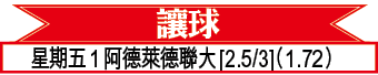 阿聯上仗作客布里斯班獅吼亦以1:3大敗,開季5戰2勝1和2負,主場兩戰全勝,主強客弱明顯。阿聯今季增添不少新兵,教練維亞迪仍然在摸索最佳陣容,年僅16歲新星穆罕默德托尼,已掩蓋哥哥哈辛托尼的光芒,擁有上乘盤球速度及突破能力,加上阿聯料有中場查維亞盧比斯復出,可望提供更多機會,以首循環阿聯作客3:5大敗,今仗趁對手兵疲,勢全力出擊報仇,入球「大」穩陣。