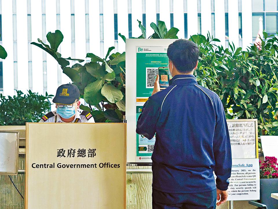 本報記者昨早到政總外觀察,因應新措施,政總天橋出入口附近多處地方張貼大量安心出行二維碼,總部入口更展示「使用『安心出行』流動應用程式」告示牌,提醒所有出入政總人士均需掃描二維碼。大部份進入政總人士均要向保安展示安心出行的掃描紀錄,才獲放行,但早上有少數人士向保安報稱:「今日冇帶電話」後,成功進入政總,未被阻撓。