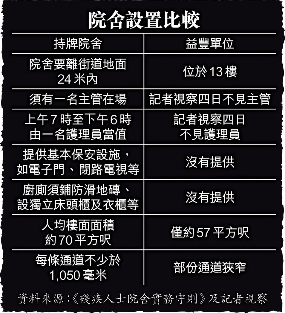 記者連日觀察,益豐單位無門牌,大門長開,約400多呎,設七個床位,住了六名精神病康復者,他們每日會到約百多米外的東興大廈源安護老院用餐,院友透露入住益豐方法,「去源安搵邱姑娘啦。」