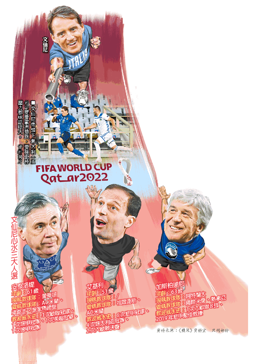 喺武漢肺炎仲未緩和下,已經延期咗一年嘅歐國盃到底搞唔搞得成仲係未知數。幾年前陷入低潮、無緣打入2018年世盃決賽周嘅意大利,近年喺教練文仙尼帶領下已經變番歐洲一流勁旅,仲係歐國盃其中一隊熱門。不過文帥最近表示,過咗2022年卡塔爾世盃就唔會再帶國家隊,但佢都留咗三個人名,包括前祖雲達斯主帥艾基利、愛華頓領隊安察洛堤,同埋阿特蘭大教練加斯柏連尼,認為都係適合接任人。