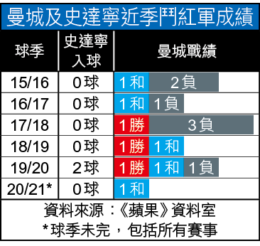 周三戴上曼城隊長臂章的史達寧為球隊攻入第二個入球,這位英格蘭前鋒取得在領隊哥迪奧拿執教下於曼城的第99球,凸顯過去五年多在哥帥悉心栽培下進攻能力得以大幅提升及更加全面,下輪聯賽作客倒戈母會利物浦,有望到達哥帥領軍下曼城百球里程碑。
