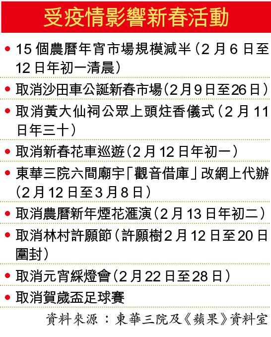 早前黃大仙祠已公佈取消讓市民親到祠內上頭炷香,屬近百年來首次,改為網上直播頭炷香祈福儀式。至於其他新春節目包括年初一花車巡遊、年初二煙花均已取消,旅發局改辦線上賀年市集與市民共度新年。
