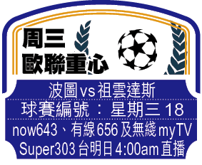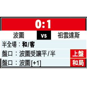 周三上演另外2場歐聯16強首回合,包括意甲班霸祖雲達斯作客葡超勁旅波圖。祖記上周聯賽不敵拿玻里,各項賽事七場不敗走勢終止,今必全力出擊,同時間主場的波圖卻遭遇四連和低潮,祖記即使作客仍可看高,少讓平/半撐上盤。