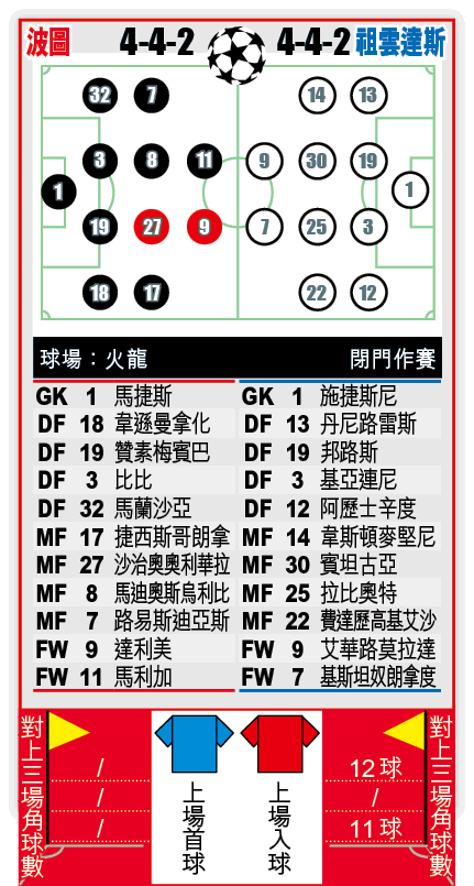 祖記今仗有保羅戴巴拿及古達度因傷缺陣,回歸祖國葡萄牙的C朗將領銜鋒線,中堅位置或會用上最具經驗的邦路斯配搭基亞連尼,陣容依然強勁。值得留意一點,去季祖記16強面對同樣被看低一線的里昂,結果首回合作客就慘吃悶棍0:1落敗,亦埋下出局的伏線。吸取去季的經驗,相信今季祖記眾將會打醒十二分精神,避免重蹈去季16強出局的覆轍。