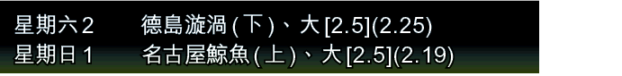 另一場下星期日,福岡黃蜂就主場對名古屋鯨魚,形勢就有啲唔同,上季鯨魚其實表現非常好,但因為球隊板凳深度不足,所以下半季出有下滑迹象。今季佢哋目標比上季更高,球隊亦現野心,甚至以聯賽冠軍為目標,無論外援及本土球員亦都有所增加。齋藤學、柿谷曜一朗加盟,上季入球能力不足問題都解決埋,相反福岡黃蜂喺本土球員上變動不大,三線實力都未見有太突出,所以傾向鯨魚讓得起半/一。