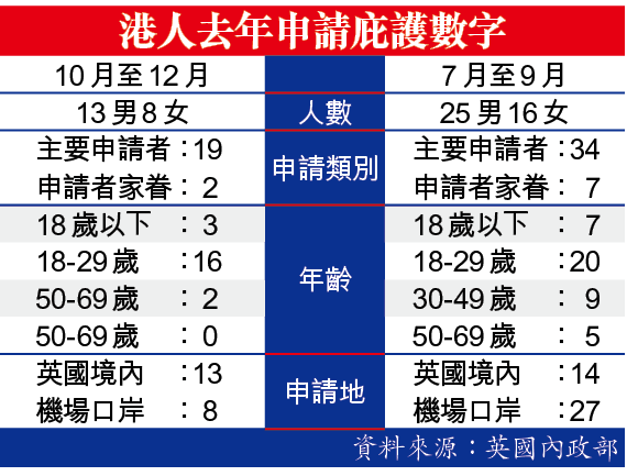 2020年共有76港人到英國尋求政治庇護,包括45男31女;當中63人為主要申請者。尋求庇護者以18歲至29歲最多,錄41人,其次是30至49歲的14人,18歲以下的有12人。