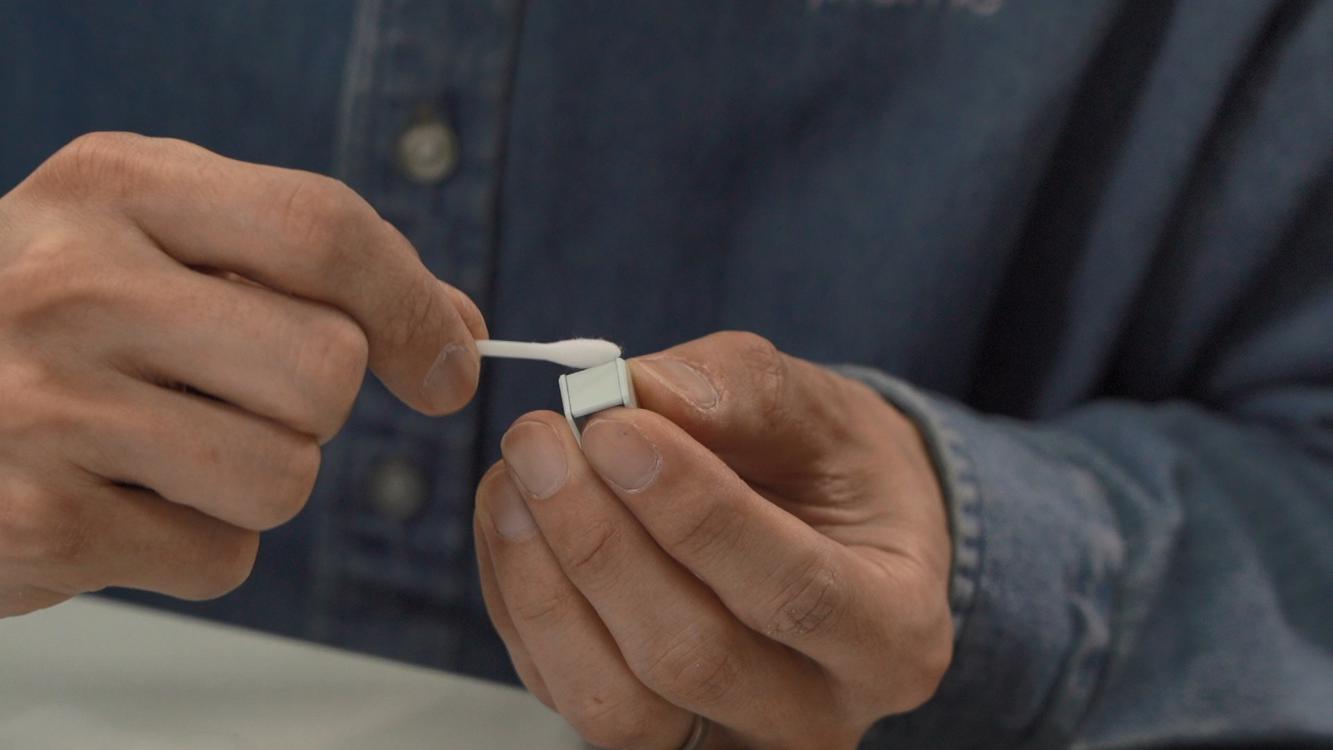 新手Flora試滲線也十分順利,不過就覺得落筆位出界不太美觀,Kenji說不用擔心,滲線一定會出界,可用珐瑯油溶液或白電油清理。只需用棉花棒沾上白電油,再在零件上輕掃即可,已滲在線內的珐瑯油不會被抹走。如果要處理一些凹位,可以將棉花棒上的棉花取出,前端的棉花變軟後就能清潔凹位。