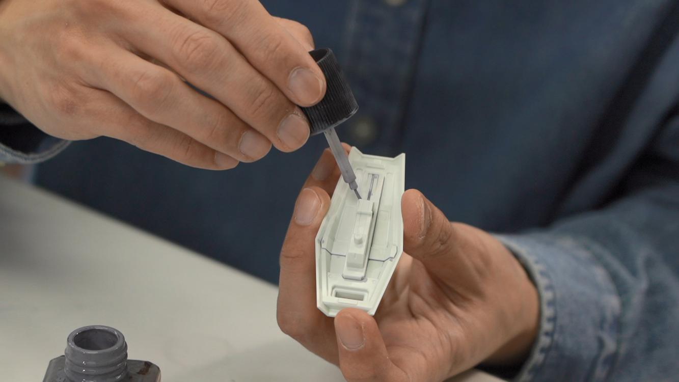 滲線液是經稀釋調配過的珐瑯油,流動性很高,用連着蓋子的刷頭沾油,點在零件的刻線上,就會自動沿線滲開。不過要注意珐瑯油會侵蝕受壓力的塑膠,不少模型友都試過滲線後零件爆裂。Kenji教路,滲線時最好先拆開零件,沒有緊合的榫位就應該不會爆膠。
