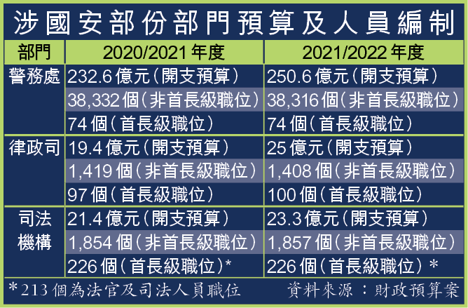 政府落閘拒絕提供資料,又指80億元的撥款與駐港國安公署無關,而本報日前曾翻查包括警務處、律政司及司法機構等多個涉處理維護國安事宜部門,其中警隊新財政年度非首長級職位為38,332個,較上一年度只減少16個,首長級職位則維持不變為74個。不過,根據國安法,警方國安處人員編制應由80億元支付,而單計首長級職位,便包括副處長(國家安全)劉賜蕙、高級助理處長(國家安全)蔡展鵬、助理處長(國家安全)江學禮及簡啟恩最少四人應屬有關編制,卻未見相關編制有作出扣減。