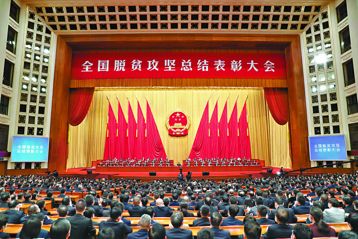習近平在該個表彰大會發表超過一小時的講話,他開首就指,在現行標準下的9,899萬農村貧困人口全部脫貧,全國32個貧困縣全部「摘帽」,習近平形容是「完成了消除絕對貧困的艱鉅任務,創造了又一個彪炳史冊的人間奇蹟。」