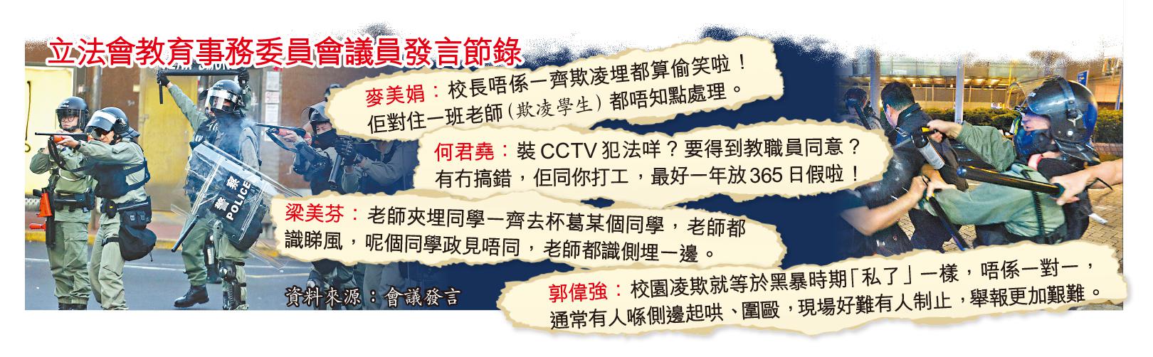 新民黨容海恩認為,教局針對校園欺凌的政策只適用於社會不撕裂的情況,促請教局實行「強硬措施」。麥美娟指投訴無門,質疑校方視而不見,「校長唔係一齊欺凌埋(學生)都算偷笑啦!」要求教局設立匿名投訴熱線。